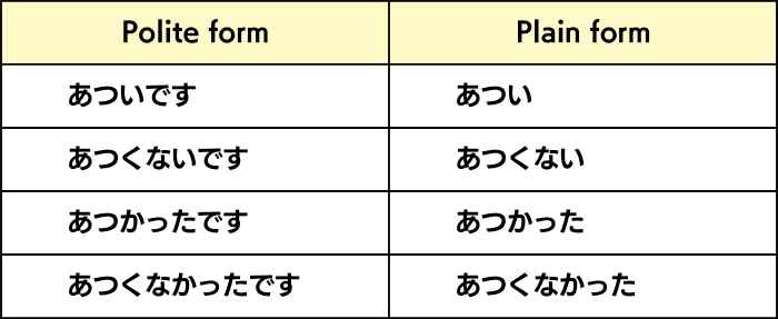 - Conjugated for tense (present or past) and affirmative/negative, and each form is created by omitting です from the polite form.