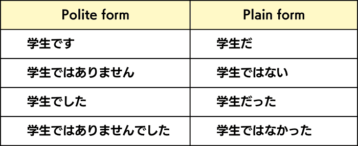 - The plain form is often used among friends and family members, while the polite form is often used in business settings or other formal situations.