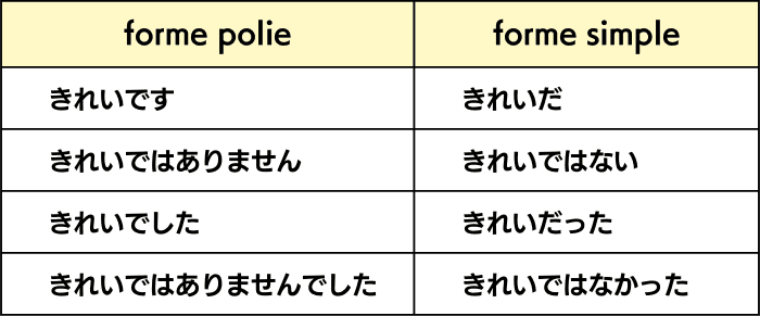 - La forme familière des adjectifs な est créée en ajoutant だ à leur radical, et だ peut être conjugué pour indiquer le temps (présent/passé) et le positif/négatif, comme だ / ではない (じゃない) / だった / ではなかった (じゃなかった).