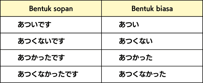 - Bentuk biasa sering digunakan di antara teman dan anggota keluarga, sedangkan bentuk sopan sering digunakan dalam lingkungan bisnis atau situasi formal lainnya.