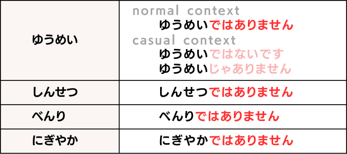 - Untuk membentuk kalimat ini, tambahkan ではありません ke batang kata sifat な.