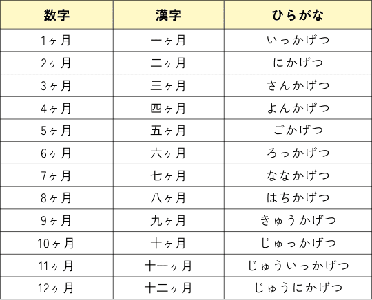 - "ヶ月 (kagetsu)" adalah kata bilangan yang umum digunakan untuk menghitung jumlah bulan dan untuk mengekspresikan durasi dalam bulan.