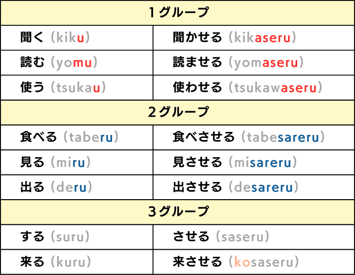 - Untuk membentuk bentuk kausatif dari sebuah kata kerja, ikuti tiga aturan berikut tergantung pada grup kata kerjanya: