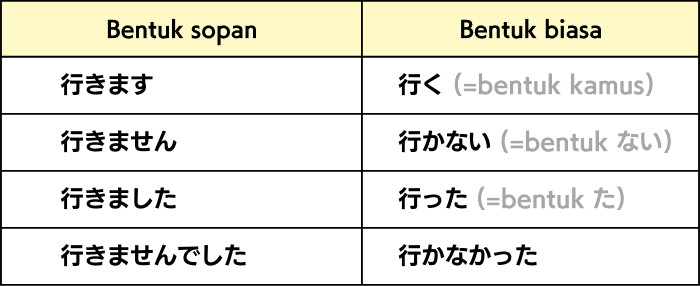 - Bentuk biasa sering digunakan di antara teman dan anggota keluarga, sedangkan bentuk sopan (bentuk ます) sering digunakan dalam lingkungan bisnis atau situasi formal lainnya.