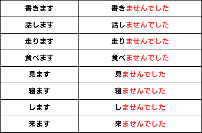 - 否定形にするには、ます形の「ます」を「ませんでした」に置き換える(例:書きます→書きませんでした)。