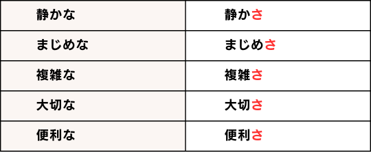 - さ形にするには、な形容詞の語幹に『さ』を付け加える。