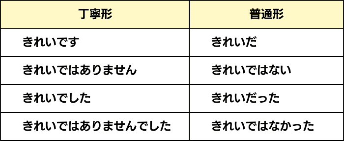 - 普通形は、友だちや家族の間で使われることが多い。一方で、丁寧形は、ビジネスやその他フォーマルな状況で使われることが多い。