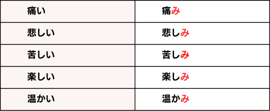 - み形にするには、い形容詞の語幹に『み』を付け加える。