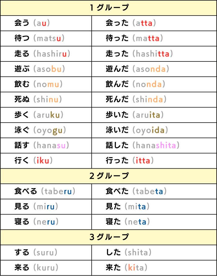 - 그룹 1: 동사의 마지막 한 글자가 'う / つ / る'이라면 'った', 'ぬ / ぶ / む'이라면 'んだ', 'す'이라면 'した', 'く'이라면 'いた', 'ぐ'이라면 'いだ' 중 하나로 바꾼다. 다만 '行く'는 예외적으로 '行った'가 된다.