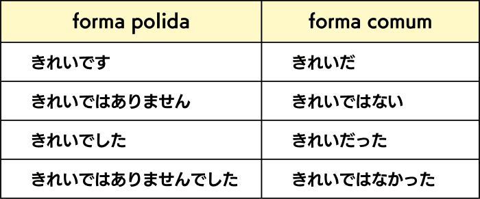 - A forma comum dos adjetivos な é criada adicionando だ ao seu radical, e だ pode ser conjugado para mostrar tempo (presente/passado) e positivo/negativo, como だ / ではない (じゃない) / だった / ではなかった (じゃなかった)