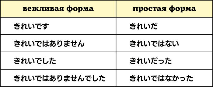 - Простая форма な-прилагательных образуется путем добавления だ к их основе, и だ может быть спрягаемо, чтобы показать время (настоящее/прошедшее) и положительное/отрицательное, такие как だ / ではない (じゃない) / だった / ではなかった (じゃなかった).