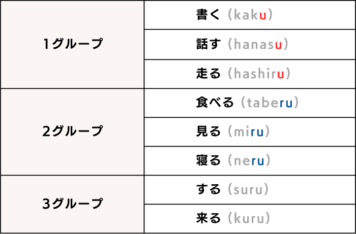 - Японские глаголы классифицируются на следующие три группы в зависимости от словарной формы и основы: