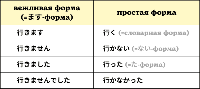 - Простая форма часто используется между друзьями и членами семьи, в то время как вежливая форма (ます-форма) часто используется в деловой обстановке или других формальных ситуациях.