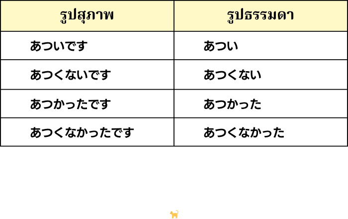 - ผันตามกาล (ปัจจุบันหรืออดีต) และบอกเล่า/ปฏิเสธ และแต่ละรูปแบบจะสร้างขึ้นโดยการละ です จากรูปสุภาพ
