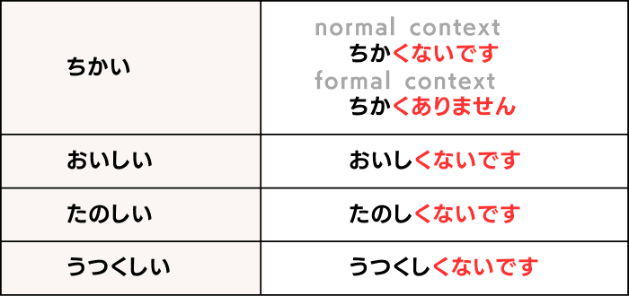 - ในการสร้างประโยคนี้ ให้วางรากศัพท์ของคุณศัพท์ い ตามด้วย くない และเติม です ที่ท้ายประโยค