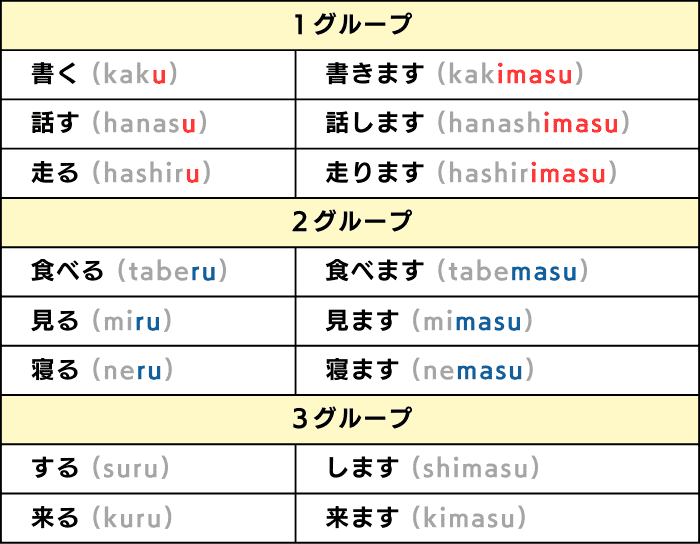 - ます shaklini hosil qilish uchun fe'l guruhiga qarab quyidagi uchta qoidaga amal qiling: