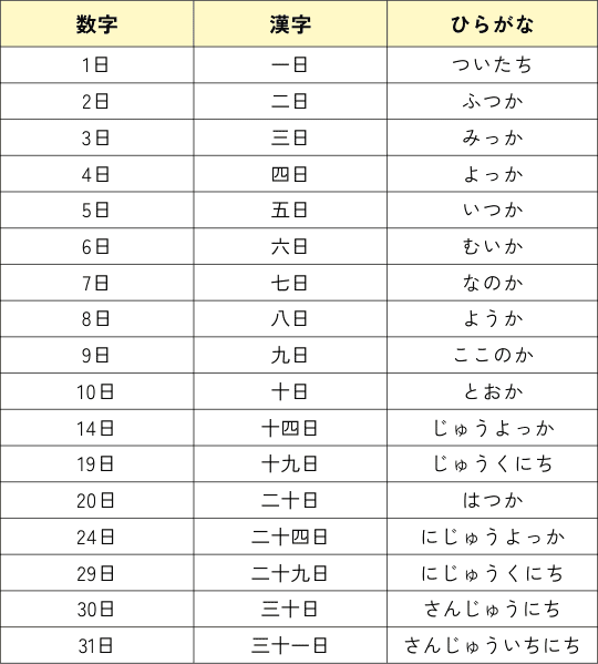 - "日 (nichi)" kunlarni sanash va sanalarni belgilash uchun keng ishlatiladigan sanash so'zi.