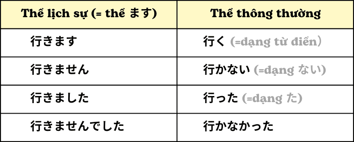 - Thể thông thường được sử dụng giữa bạn bè và các thành viên trong gia đình, trong khi thể lịch sự (dạng ます) thường được sử dụng trong môi trường kinh doanh hoặc các tình huống trang trọng khác.