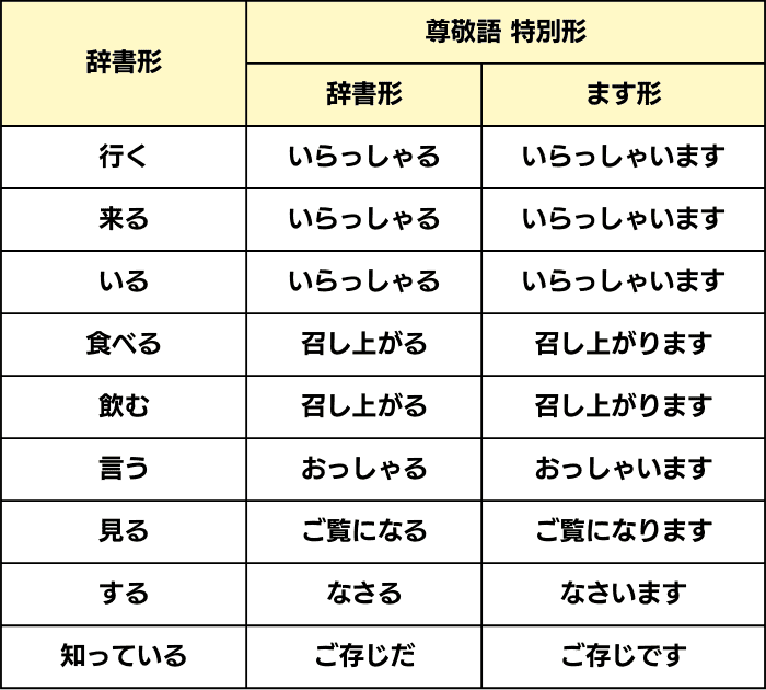 - 特殊形是尊敬语的一种形式,动词的变化没有固定规则,每个动词都有自己的特殊形式。