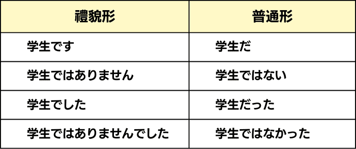 - 名詞的普通形經常在朋友與家人等之間使用。反之,名詞的禮貌用語則經常在職場和其他正式場合中使用。