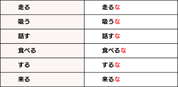 - 禁止形的變化為:在動詞的辭書形之後加上「な」。