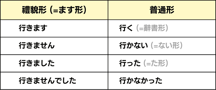 - 動詞的普通形經常在朋友與家人等之間使用。反之,動詞的禮貌用語(ます形)則經常在職場和其他正式場合中使用。